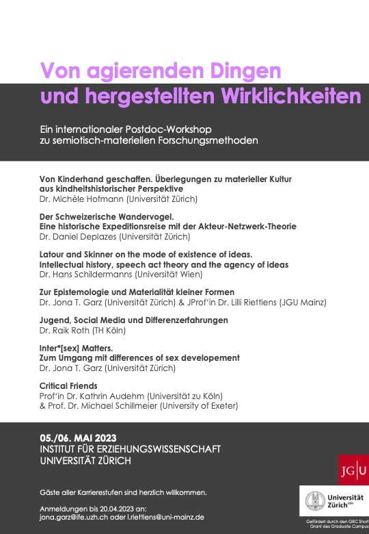Gemeinsam organisieren Jona T. Garz und ich Anfang Mai 2023 einen internationalen Workshop für PostDocs zu semiotisch-materiellen Forschungsmethoden an der Universität Zürich.